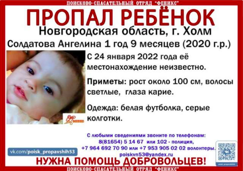 Сегодня, 26 января, в Следственном управлении СКР по Новгородской области поделились подробностями драматичной истории в Холме, где 25 января стало известно об исчезновении маленькой девочки – Ангелины Солдатовой. Ей 1 год 9 месяцев.