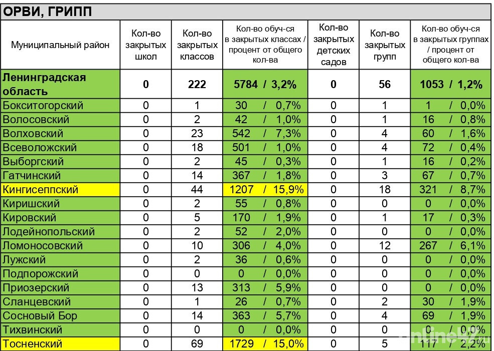 По ОРВИ и гриппу на карантин в Ленинградской области ушли 222 класса (3,2% от общего количества) почти во всех районах. Исключение – Подпорожский и Тихвинский. Что касается детских садов – 56 закрытых групп, 1053 ребёнка (1,2% от общего количества).