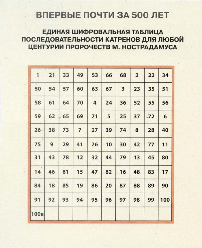 Для начала катрены группируются в отдельные группы соответствующие дате и событию. По единой шифровальной таблице последовательности катренов для любой центурии пророчеств М. Нострадамуса-статья:"Впервые в мире".