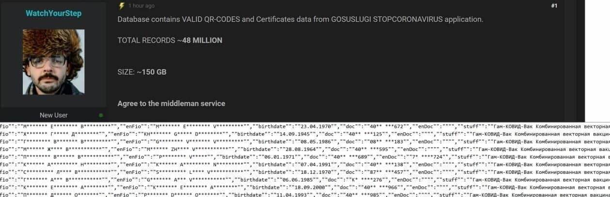 Хакеры получили данные из приложения «Госуслуги Стоп Коронавирус». База продается за 100 тыс. долларов и содержит первые буквы ФИО, дату рождения, первые две и последние три цифры номера паспорта, а также название вакцины и QR-код.