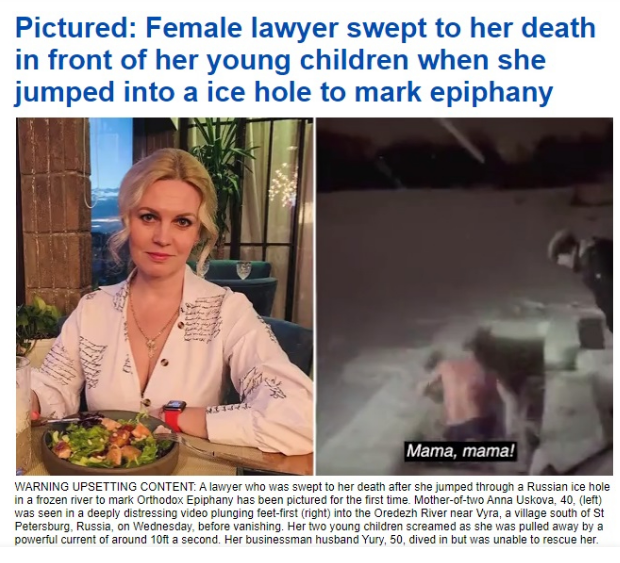 Как отмечается в тексте издания, "женщина-юрист погибла на глазах у своих маленьких детей, прыгнув в русскую прорубь, чтобы отметить Крещение". Из-за сильного течения - около 10 футов в секунду или 3,05 м/с - Анна не смогла выбраться на поверхность. Почувствовав неладное, ее маленькие дети закричали и стали звать маму. Муж Анны бросился в прорубь, но не смог спасти супругу.