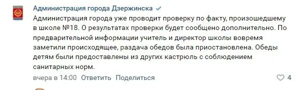 И буквально через полчаса уже стало известно, что кухонный рабочий работает в столовой с ноября 2021 года, а вот на раздаче с января. Оказывается, не только ученики заметили ручную раскладку пищи, но и директор с учителями и сразу же мужчине влепили выговор и штраф. Только вот почему-то объяснениям Администрации Дзержинска в сети не очень поверили.