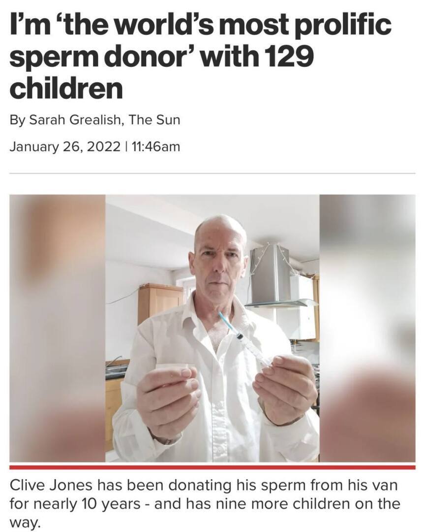 У каждого своё хобби. Клайв Джонс, например, любит сдавать свою сперму. Теперь он отец 129 детей. На сегодняшний день он является самым плодовитым донором спермы в мире: 129 уже рожденных детей и еще 9 текущих беременностей. Его цель — достичь отметки в 150.