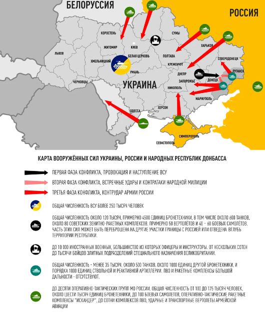 Народная милиция ДНР сообщила, что Киев активно стягивает в регион вооружение для формирования ударных групп: реактивные системы залпового огня и бронетанковые соединения. Расположение этой техники ближе чем в 70 км от линии боевого соприкосновения – прямое нарушение Минских соглашений. Секретарь президента России Дмитрий Песков заявил журналистам, что угроза нападения Украины на самопровозглашённые республики крайне высока. Сейчас Донбасс живёт в ожидании украинского удара. Запад же уверен: Москва решится на вторжение, и лишь гадает: будет ли оно небольшим, с ограниченными целями, или же русские дойдут до Киева. Самое время посмотреть, какими силами располагают стороны, как эти силы расположены и что они могут.