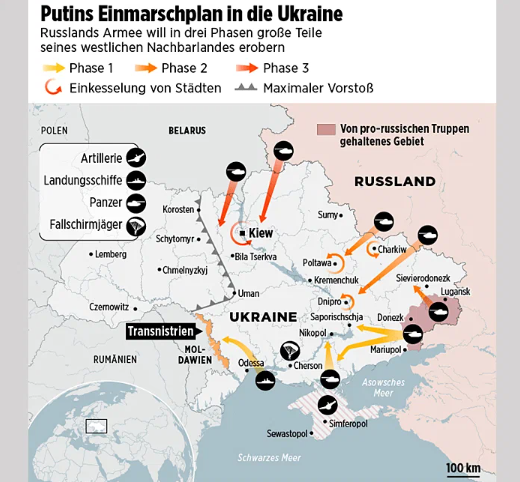Что же известно о расположении войсковых группировок России, которые дамокловым мечом нависли над Украиной? В декабре немецкая газета Bild опубликовала схему вероятного вторжения России на Украину. По данным издания, наступление будет вестись с нескольких направлений с глубоким проникновением в украинскую территорию.