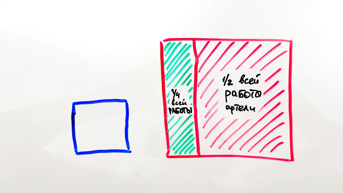 Во второй половине дня на большом поле работала половина артели, поэтому вполне логично, что сделали они в два раза меньше, то есть четверть всей работы (заштриховано зеленым).