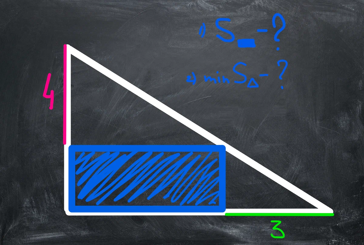 В прямоугольный треугольник вписан прямоугольник так, как показано на рисунке ниже. И два вопроса: 1) нужно найти площадь прямоугольника и 2) отыскать площадь минимального треугольника, удовлетворяющего этих условиям.