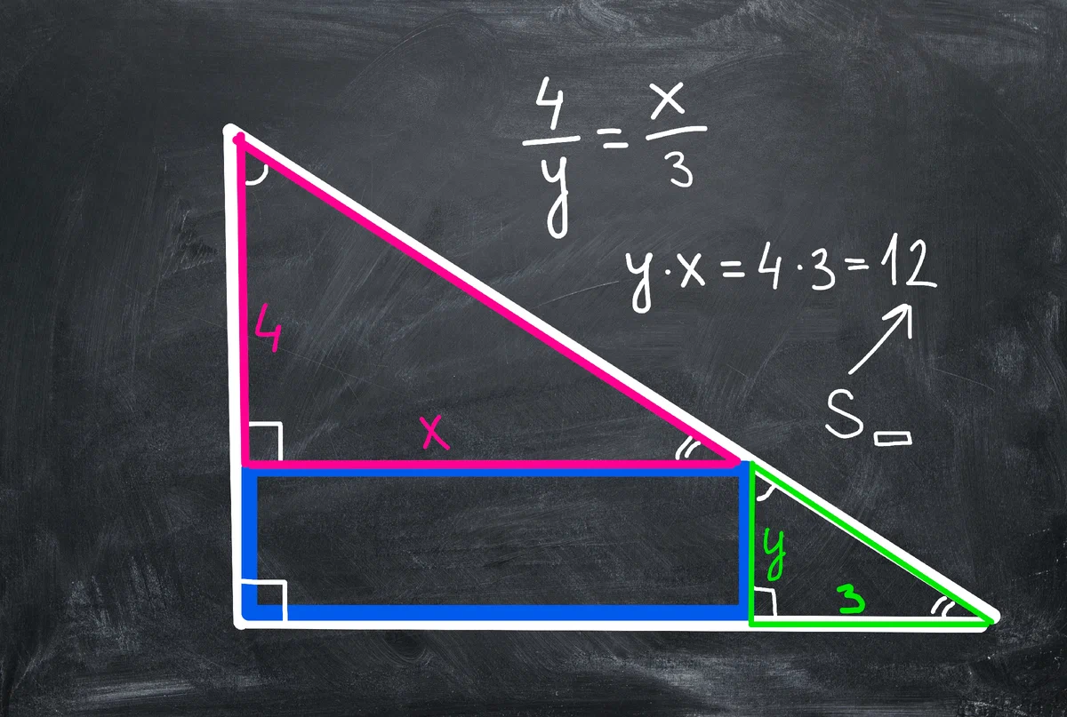 Сначала найдем площадь прямоугольника. Это легко. Смотрите рисунок ниже. Красный и зеленый треугольники подобны по двум углам (не буду подробно расписывать из чего следуют такие выводы — это уж совсем просто). Поэтому длины соответствующих стороны имеют одинаковое отношение и мы можем записать 4:х=y:3. Теперь перемножим крест-накрест по правилу пропорции и получим x•y=4•3=12 — это и есть площадь прямоугольника.
