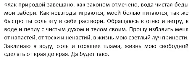 Лучше всего ритуал проводить в полночь, когда энергетика прожитого дня угасает, а энергетика нового только зарождается. Перед ритуалом необходимо принять душ или ванну, быть чистыми, а также надеть свежую белую рубашку. Поставьте чашу с жидкостью в центр стола, а вокруг нее свечи, как бы обозначая стороны света: север, юг, запад и восток. Зажгите свечи сверху, двигаясь по часовой стрелке. Делать это необходимо спичками, а не зажигалкой. Затем, когда свечи будут зажжены, произнося слова заговора, всыпайте в чашу с водой горсть соли. Вам ее должно хватит ровно до конца прочтения.