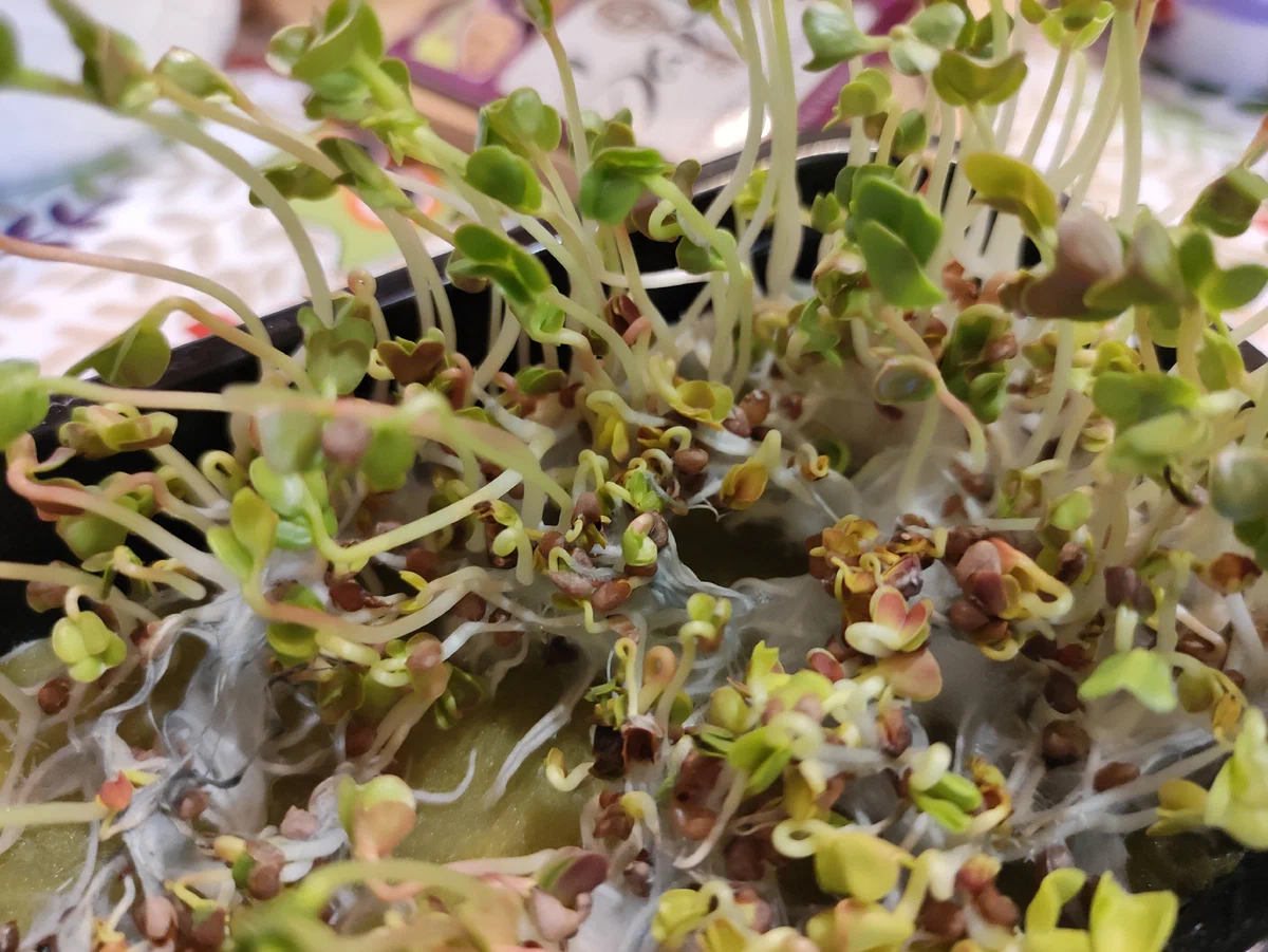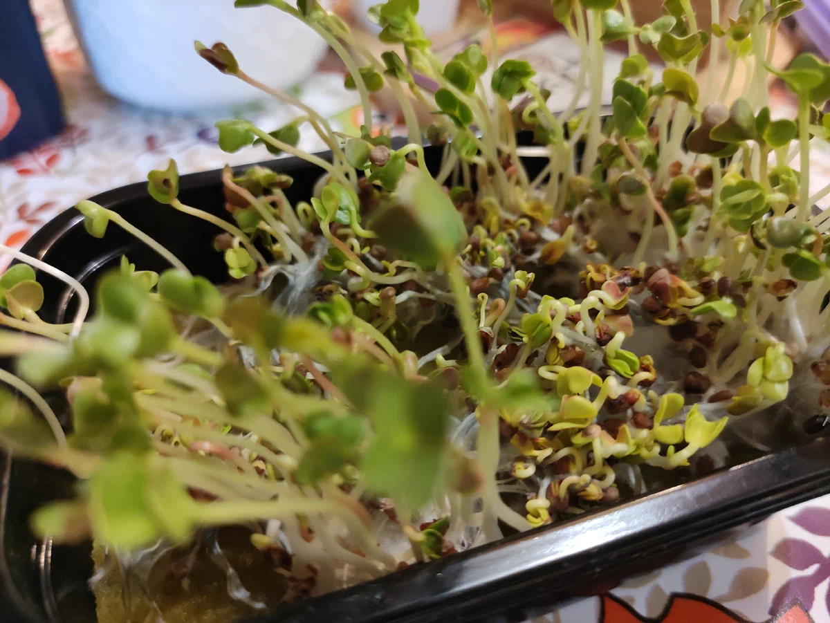 А дальше начинается самое интересное: контейнеры заливаются водой, посыпаются семенами горчицы, редиса, и прочей растительности, накрываются плёнкой и уже через пару недель все подоконники забиты микрозеленью: