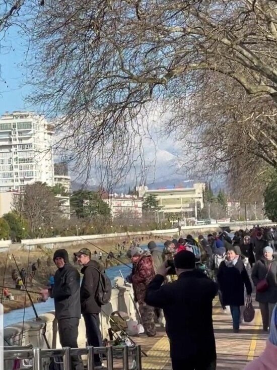 Накалилась обстановка и в центре самого курорта, там мужчины с удочками толпами штурмуют набережную реки Сочи. 27 января рыбаков на улице Конституции СССР стало настолько много, что они стоят плечом к плечу, мешая пройти обычным гражданам.