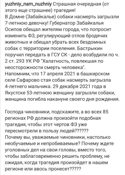 А самым громким случаем за последнее время стала гибель 7-летнего ребенка в селе Домна Читинского района Забайкальского края. Девочка возвращалась из музыкальной школы через частный сектор 22 января 2022 года. Когда она вовремя не пришла домой, родители забили тревогу и отправились на поиски. Вскоре ее тело со следами укусов нашли на пустыре.