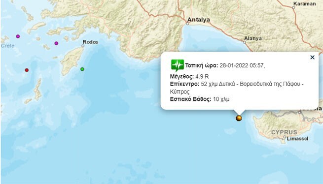 Землетрясение магнитудой в 4,9 балла, произошедшее в 5:57 утра, разбудило жителей Кипра. Эпицентр подземного толчка находился в 57 километрах от города Пафос.