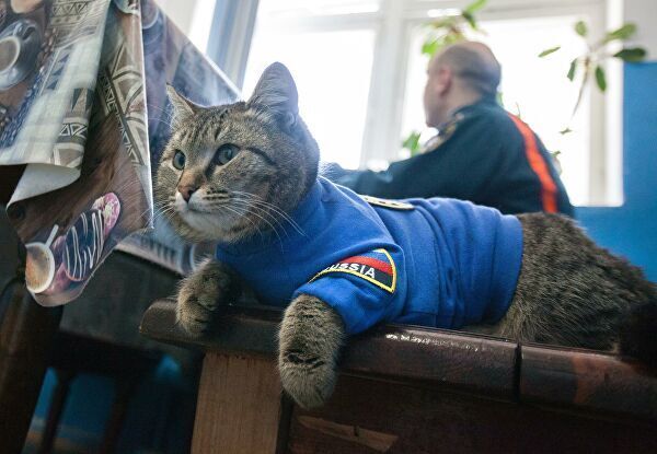 Как и положено, на работу кот ходит в пожарной форме как все спасатели.