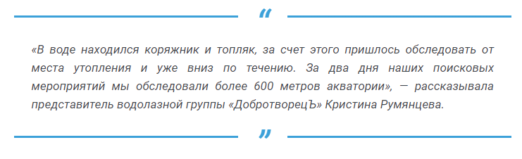 Напомним, что искали женщину и волонтеры и спасатели. Водолазы проводили работы на глубине от 0,4 метра до 2 метров в ледяной воде при видимости 1,5–2 метра. Осложняло ситуацию течение, скорость которого составляла 0,8 м/с, песок и растительность на дне реки.