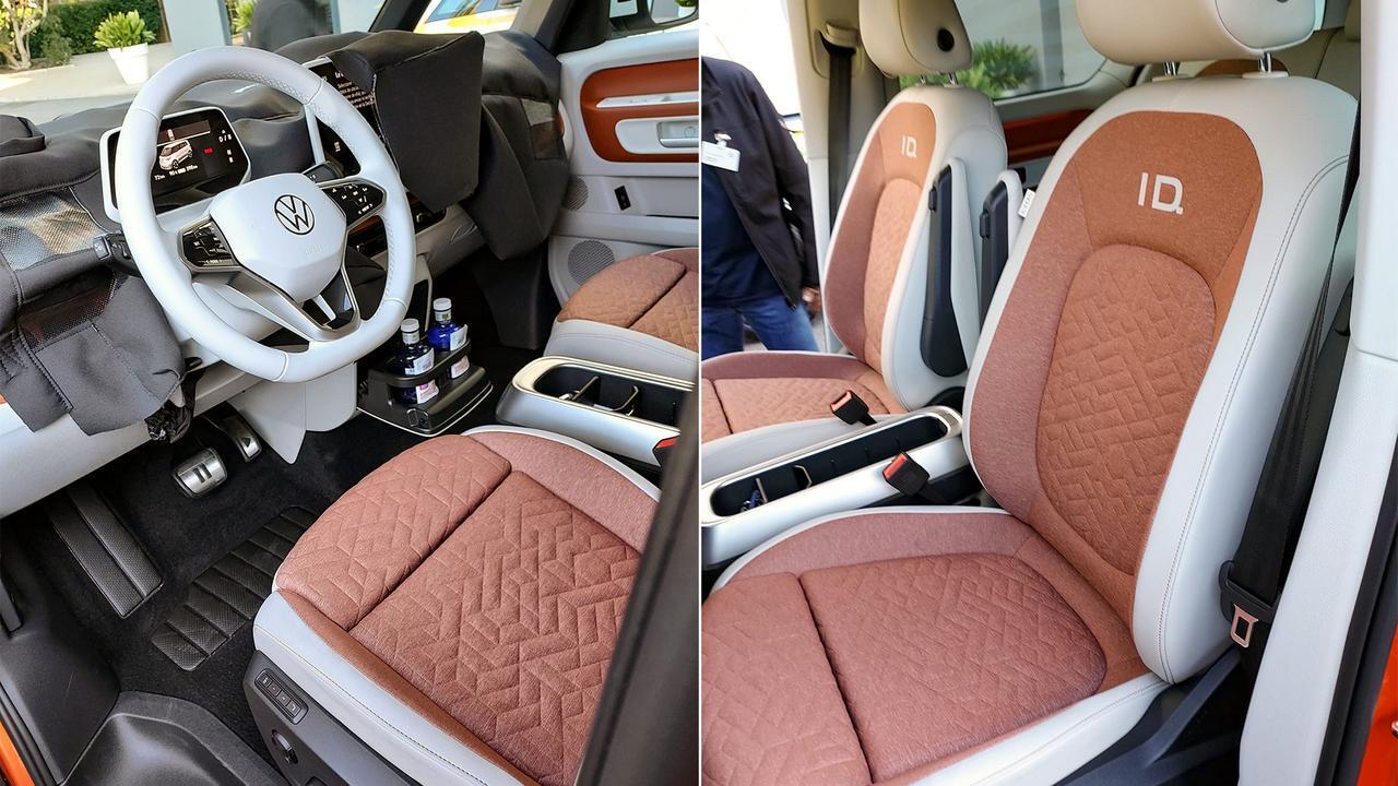 Судя по опубликованным фотографиям, кабина электрического наследника Type 2 во многом повторит модели семейства ID. Ему достался мультируль, как у ID.3 и ID.4, аналогичная цифровая приборная панель и мультимедийная система. При этом центральные дефлекторы, под которыми находится подставка для двух бутылок, выглядят немного иначе. Между сиденьями и в дверных картах есть небольшие отсеки для хранения мелочей.