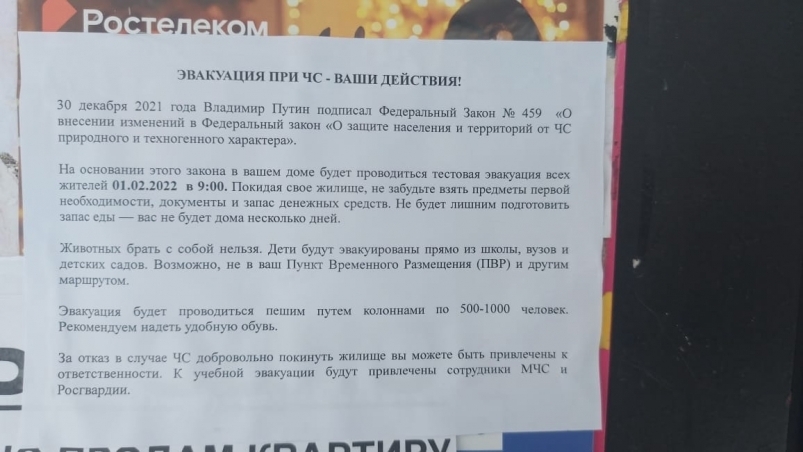 В населённых пунктах Камчатского края появились расклеенные объявления о якобы назначенных на 9 утра 1 февраля 2022 года пробных эвакуациях жилых домов пешими колоннами, сообщает ИА KamchatkaMedia со ссылкой на пресс-службу ГУ МЧС России по Камчатскому краю.