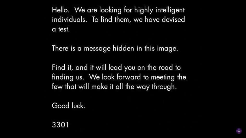 «Мы ищем людей с высоким интеллектом. Для этого мы разработали тест. В этом изображении есть скрытой сообщение. Найдите его, и оно покажет Вам как нас найти. Удачи. 3301»