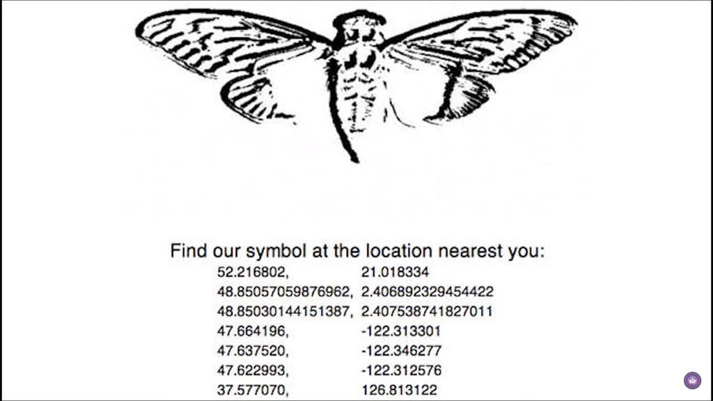 Позвонив по нему, они услышали «Очень хорошо. Вы отлично постарались. Три простых числа связаны с этой картинкой. 3301 – одно из них. Надо найти еще два. Умножить их друг на друга и добавить .com. Удачи. Пока» Голос отправил их на очередной сайт. На зашифрованном сайте висело изображение цикады с цифрой 3301 и список геолокаций соответствующий 14 городам мира от Москвы до Лос-Анджелеса.