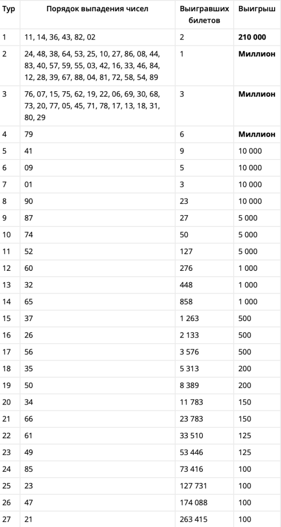 Также, после оглашения официальных результатов сегодняшней игры, примерно после 10:30 по московскому времени проверить сумму выигрыша лотерейного билета можно будет по его номеру
