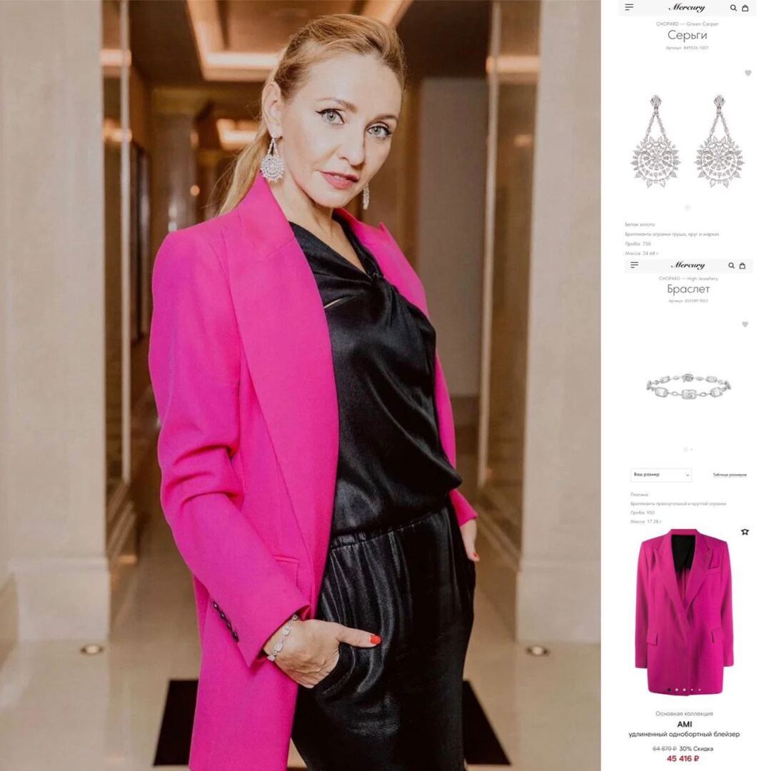 Сверху Татьяна Навка накинула блейзер цвета бешеной фуксии от AMI – в ЦУМе он стоит 64 879 рублей, но сейчас действует 30%-ная скидка (всего-то 45 416 рэ).
