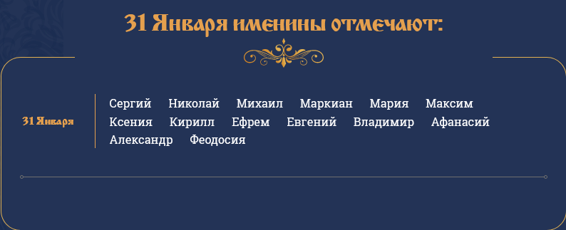 По церковному православному календарю 31 Января, отмечается всего 14 именины: 11 мужских и 3 женских. Список именин поможет в выборе имени для мальчика или девочки, рожденных в этот день.
