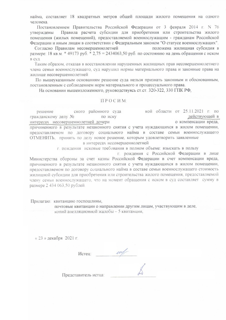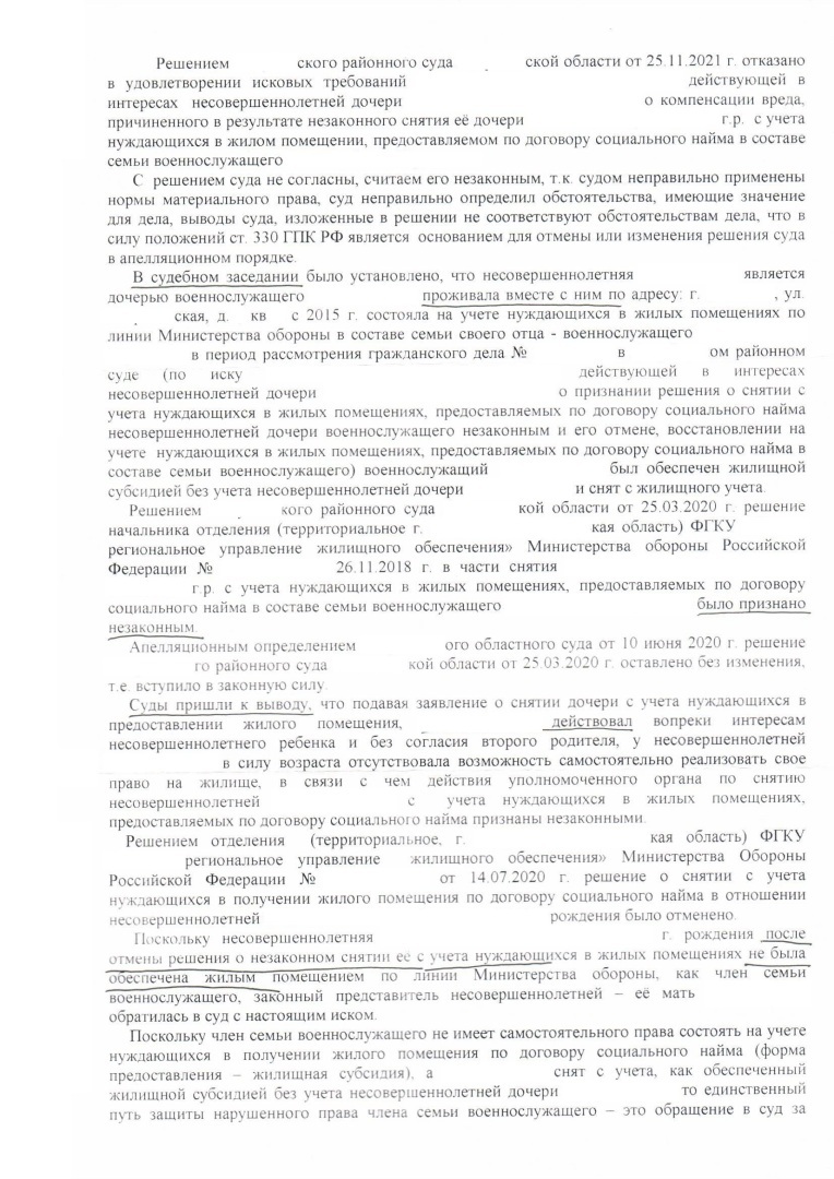 В продолжении всего что я опубликовал, в направлении военной субсидии. Продолжает бывшая жена попытки получить на ребёнка нашего причитающуюся как она считает часть военной субсидии. Так, в декабре прошлого 2021 года, снова подала исковое заявление, но уже на ущерб со стороны государства нанесённый ребёнку от РУЖО г.Ростов-На-Дону. Естественно первую инстанцию БЖ проиграла, но на этом не успокоилась и уже в январе была подана кассация в областной суд, меня указали как третья сторона. Но самое интересное, то что БЖ наняла адвоката, который всячески извращает информацию о прошлых годах жизни, в частности уже приписали, что ребёнок проживал со мной всё оставшееся время, пока я не уволился, тем самым, вводя суд в заблуждение, велось общее хозяйство, когда его и близко не было. Т.е. всяческими путями старается получить те денежные средства, которые уплыли от неё. Посмотрим решение второй инстанции, я думаю оно будет без изменений.