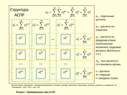 Очень интересна статья Б.А. Волчкова 1968 года, в которой он объясняет, почему был принят именно такой дизайн системы. Он рассматривает два «крайних» варианта построения АСПР: когда «один-в-один» оцифровывается действующий порядок работы Госплана, в этом случае качество планирования растет только за счет того, что машины реже ошибаются, а у людей высвобождается время подумать над планом по существу, и когда задается целевая функция развития страны, и система выстраивается так, чтобы эту функцию максимизировать [1, с. 48]. Дискуссия об одном «идеальном» показателе развития шла с конца пятидесятых, с первых конференций по оптимизационным моделям, так как чтобы что-то оптимизировать, надо понимать, по какому критерию оптимизировать. Б.А. Волчков признает, что: «В настоящее время такая постановка задачи для плана в целом не может быть практически осуществлена» [1, с. 49]. Вывести один-единственный показатель, характеризующий развитие всей страны, невозможно.