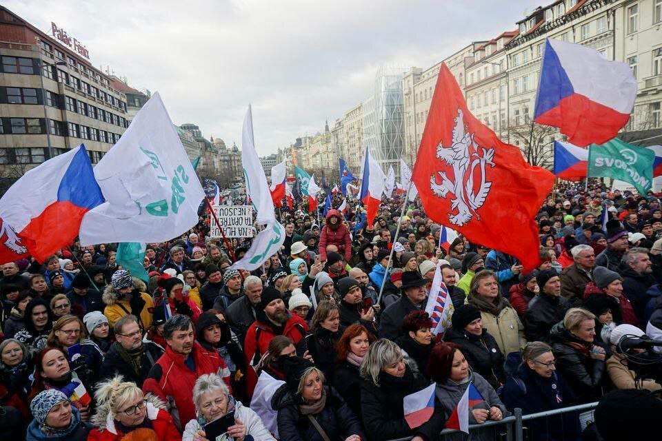 ❗️Тысячи чехов собрались в воскресенье на Вацлавской площади Праги, размахивая флагами и скандируя лозунги против ковид-ограничений