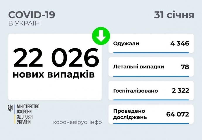 За сутки 30 января в Украине зарегистрировали 22 026 случаев заболевания Covid-19 и 78 смертей от осложнений, госпитализировали 2 322 человека.