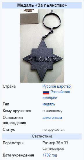 Медаль «За пьянство» — чугунная медаль введённая с целью борьбы против пьянства.