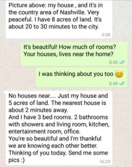 Присмотритесь к деталям. В рассказах мошенников постоянно встречаются несовпадения, потому что вас много, а он один, ему некогда фактчекать свои письма. Например, он говорит, что живет в большом доме, а на видео показывает только маленькую комнату. Или он пишет, что у него дом и 8 акров (3,2 га) земли, а на следующий день сообщает, что у него 5 акров (2 га). Как на примере ниже. Ну взял человек другой шаблон, ну бывает: