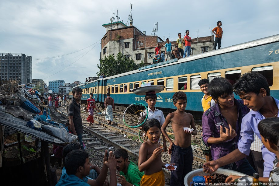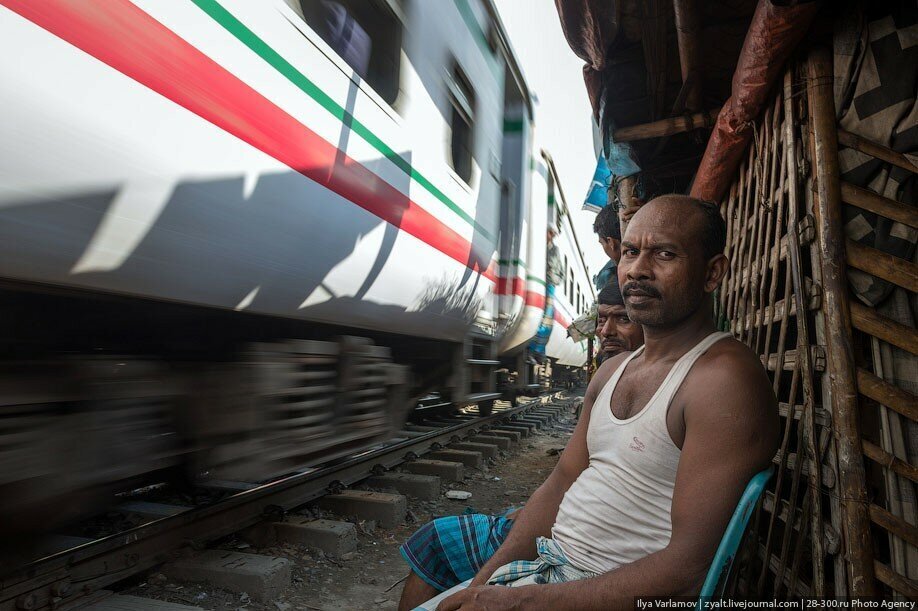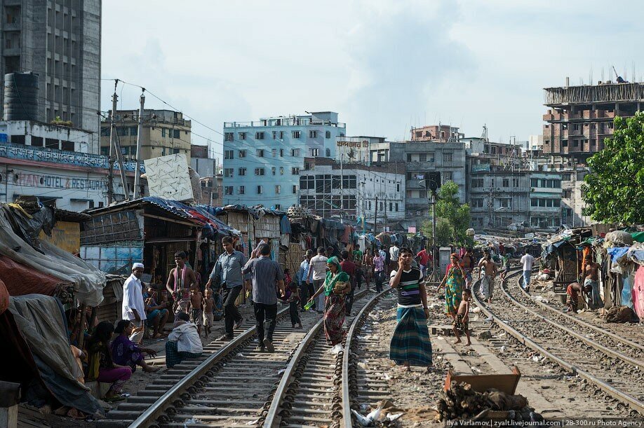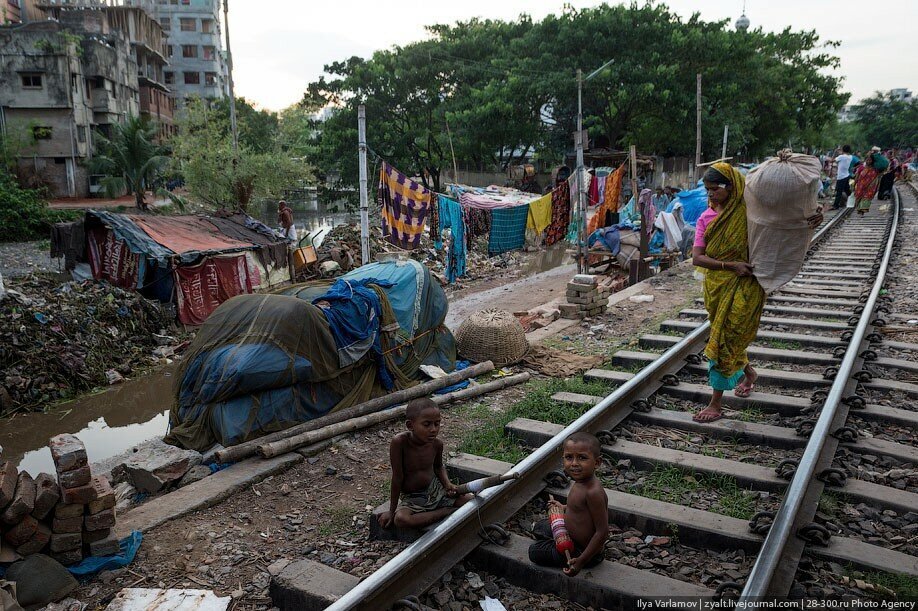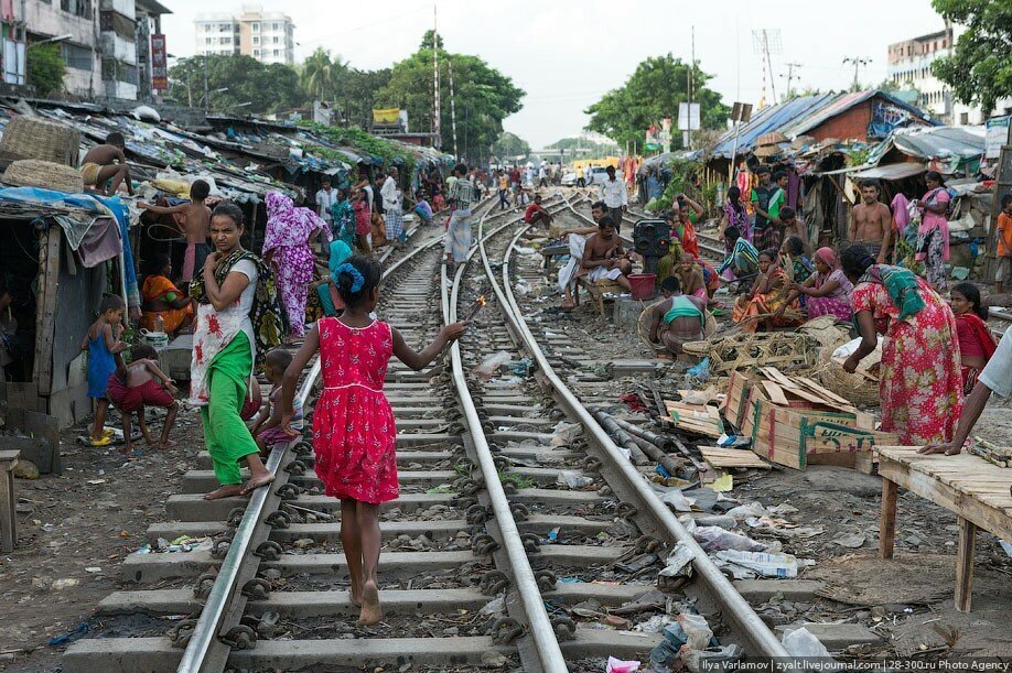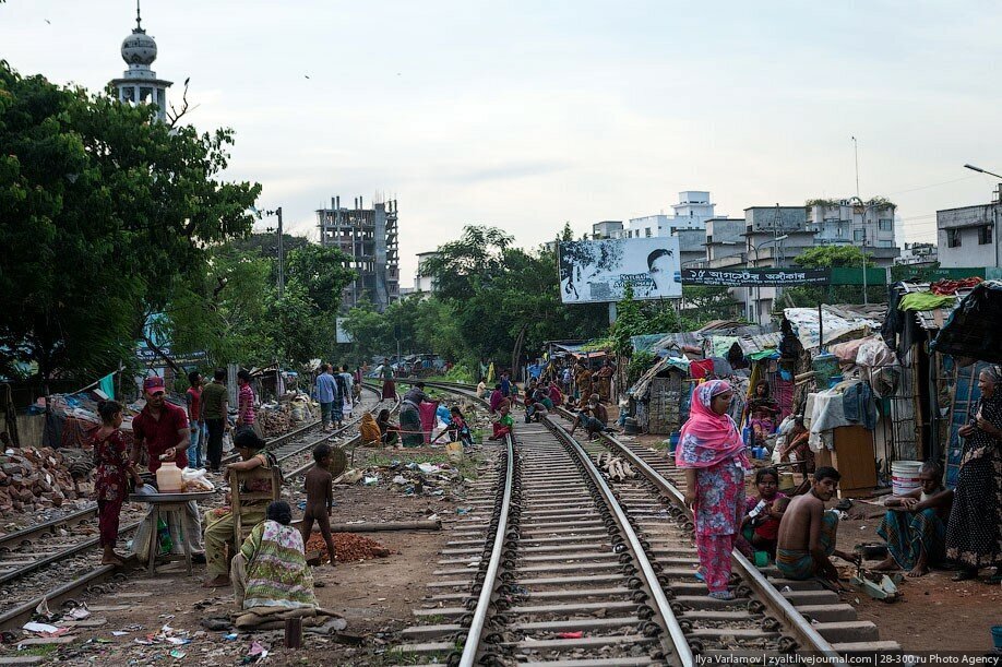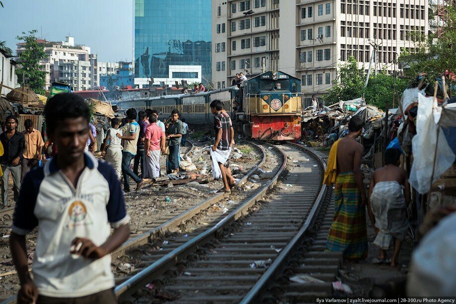 В Бангладеше есть чудесные трущобы вдоль железнодорожных путей. Именно там протекает настоящая жизнь! В городе свободного места давно нет, единственная доступная земля есть вдоль железной дороги. Здесь и строят свои маленькие домики тысячи бедняков. Вся жизнь здесь проходит на рельсах. На них играют дети, готовят еду, чистят одежду, продают что-то. Между путями устраивают огороды. Порой кажется, что пути эти давно заброшены, но тут раздается гудок и люди мгновенно разбегаются, освобождая дорогу поезду.