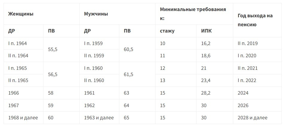 В связи с проведением пенсионной реформы существенно изменился график выхода на пенсию. В первую очередь, это связано с повышением пенсионного возраста на 5 лет для женщин и мужчин, которое будет происходить поэтапно с 2019 года (см. таблицу по годам).