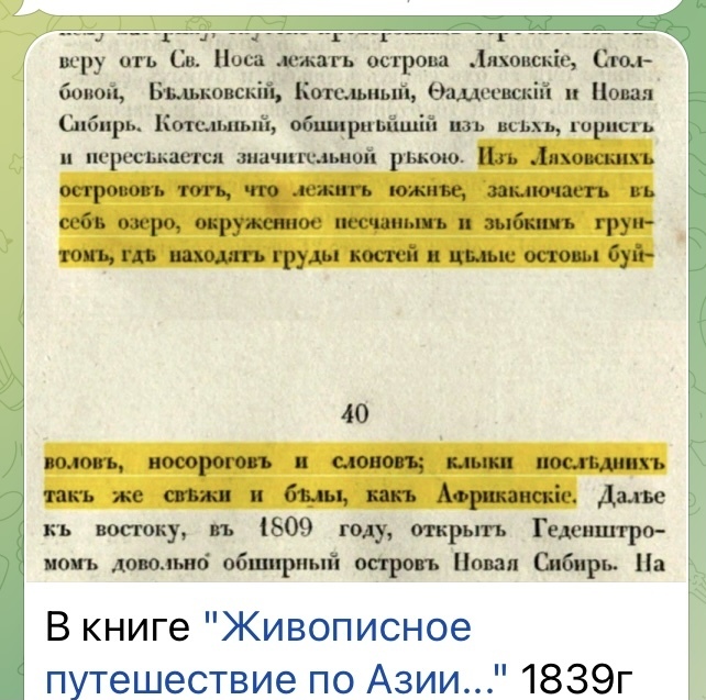 Кроме того, В книге "Живописное путешествие по Азии..." 1839г описывают находки на Ляховских островах (в акватории Северного ледовитого океана).