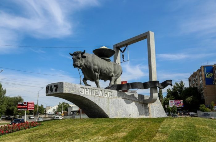 Установлен в 2003 году. Высота 3 метра. Посвящён монумент прошлому города и округи. Когда соль была очень дорога, её добывали неподалёку и возили по торговым маршрутам, волы и быки были главными транспортными средствами. Памятник представляет собой быка с солонкой на спине, который как бы выходит из герба Энгельса. Хотя специализация города сменилась, это – часть его истории.