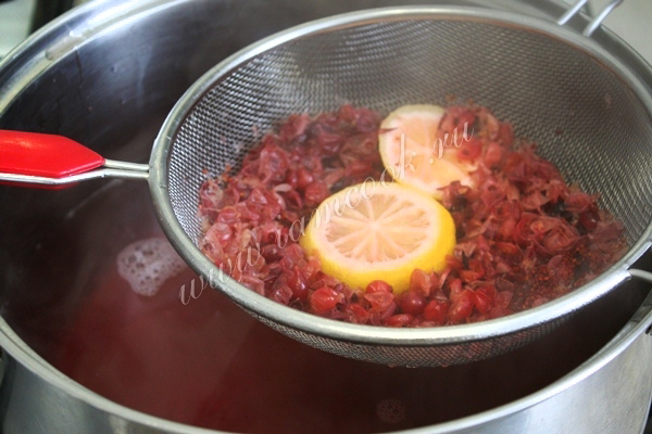 В кастрюлю налить воду и вскипятить. Бросить жмых от клюквы в кипящую воду. Также положить в кастрюлю дольки лимона вместе с кожурой. Дать компоту покипеть 5-10 минут.