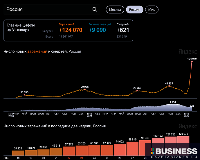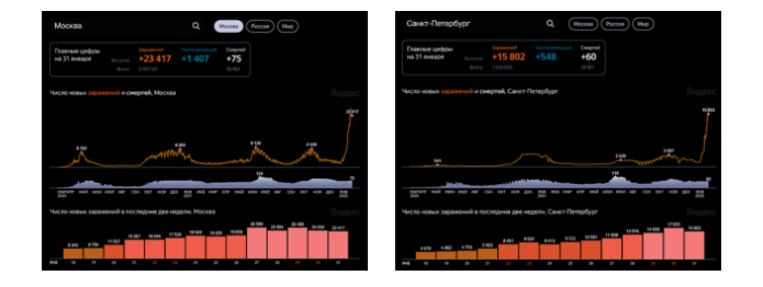 Так, 31 января в Москве зафиксировано 23417 заразившихся и 75 госпитализаций, в Санкт-Петербурге 15802 и 60 соответственно.