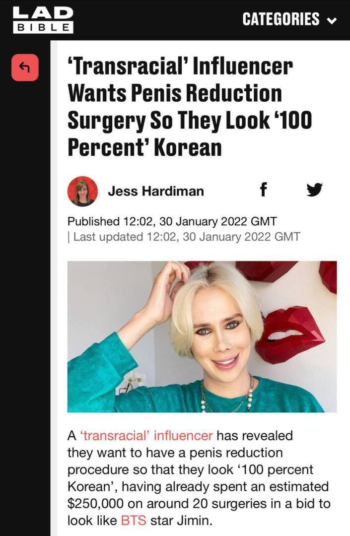 Есть те, кто меняет пол, а вот англичанин Оли Лондон решил поменять расу и национальность, чтобы перевоплотиться в участника группы BTS Чимина. Оли уже сделал 20 пластических операций. Осталось последнее. Средняя длина члена у корейцев всего 9 сантиметров. Оли уже нашёл специального человека в Таиланде. Операция обойдется ему в 8 тысяч фунтов. Интересно, как к этому перевоплощению относятся корейцы?