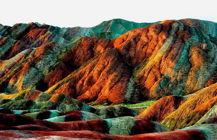 Часть гор покрыта зелеными растениями. И это добавляет горам особую красоту, делая их еще необыкновеннее и привлекательнее. Чжанъе Данксиа – невероятное чудо природы, навевающее своим видом мысли о большом разноцветном слоеном торте, а может быть раскатившиеся нежные тюки знаменитого яркого и неповторимого китайского шёлка.