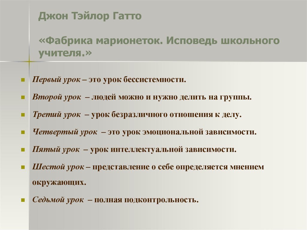 Пятый урок, который я даю детям, – это урок интеллектуальной зависимости. Ученики ждут, когда учитель скажет им, что надо делать. Важнейшим уроком, который получают дети в школе, является тезис о том, что в жизни можно и нужно полагаться на мнение других людей – более умных, более опытных, более образованных. Только я, учитель, вправе решать, что именно будут учить мои дети, вернее сказать – те, кто мне платит, принимают решения, которые я потом претворяю в жизнь. Если мне говорят, что эволюция является фактом, а не теорией, я передаю это дальше, не рассуждая об этом и наказывая отступников, которые отказываются думать так, как считают нужным начальники от образования. Право контролировать мысли детей, решать, что именно они должны думать по тому или иному поводу, позволяет мне легко разделять учеников на успешных и неуспешных.
