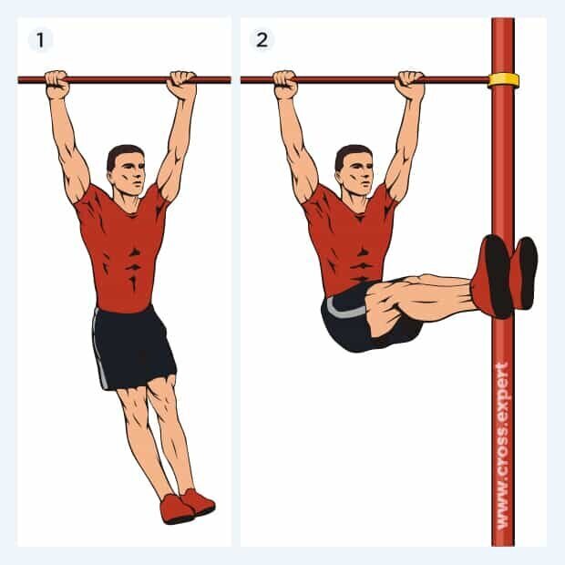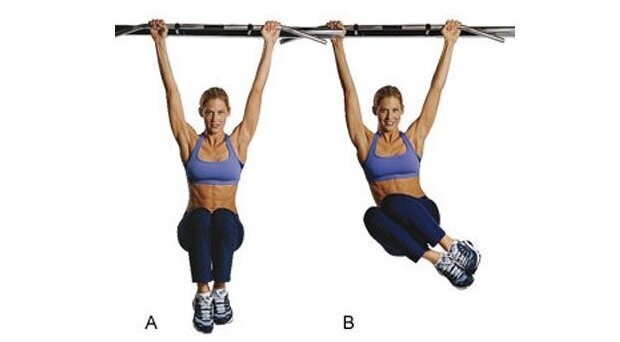 -Повисните на перекладине, согните ноги в коленях и поднимите их до параллели бедер с полом.