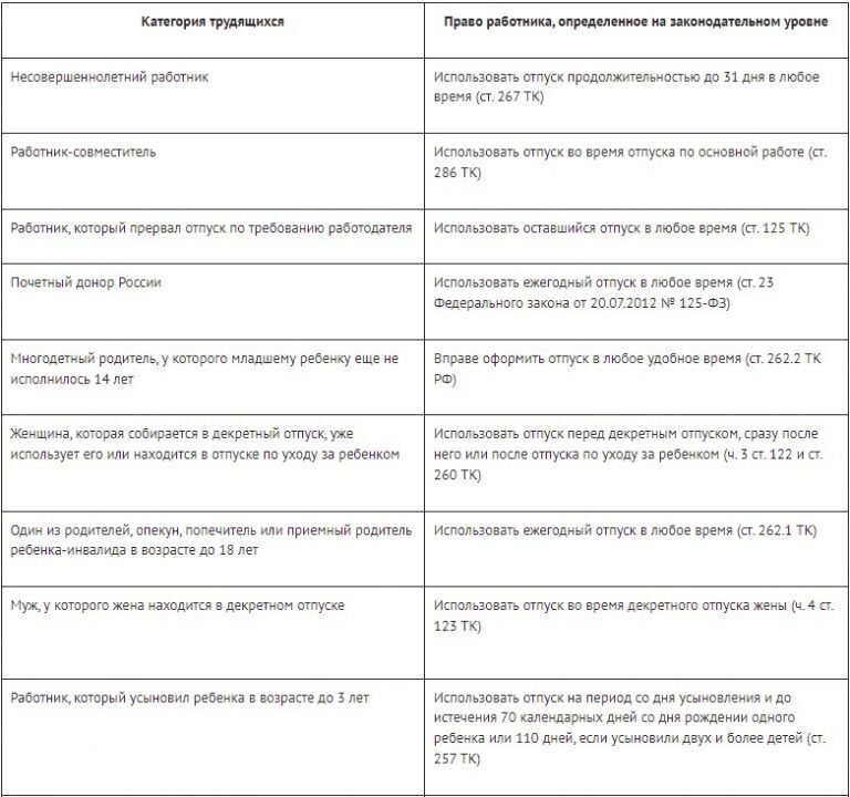 Полный перечень категорий, который имеет право на отпуск в любое время приведен в таблице: