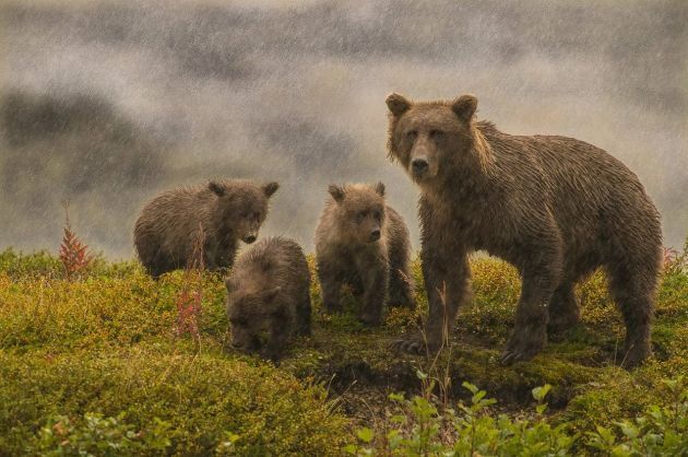 Фотограф повстречал семейство медведей гризли, проплывая по реке в национальном заповеднике Катмай на Аляске.