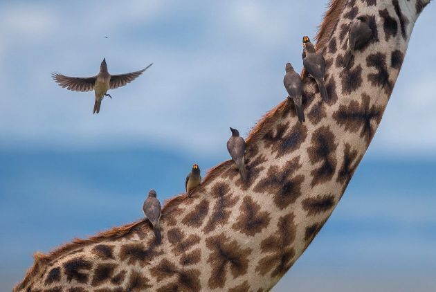 Группа птиц Выпь, (Водяной бык) сидят на спине жирафа, так они питаются насекомыми, которые накапливаются на шкуре.