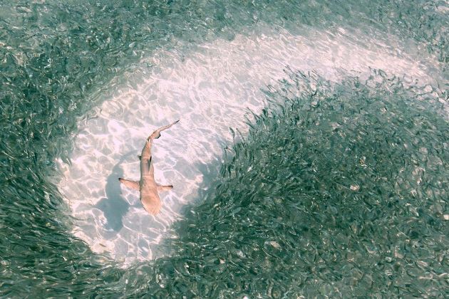Детеныш Черноплавниковой (чернопёрой) рифовой акулы проплывает через косяк серебристых шпрот на Мальдивах.