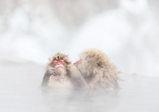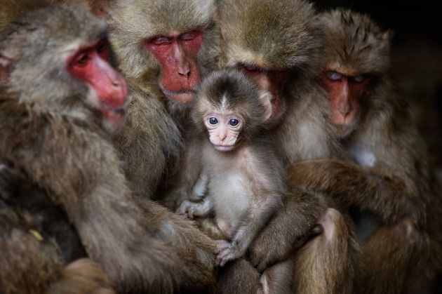 В холодную погоду макаки собираются вместе, чтобы согреться.