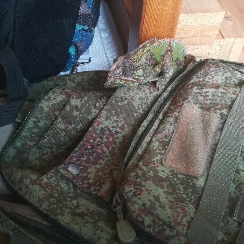 А здесь хамелеон прячется на рюкзаке. Попытка засчитана