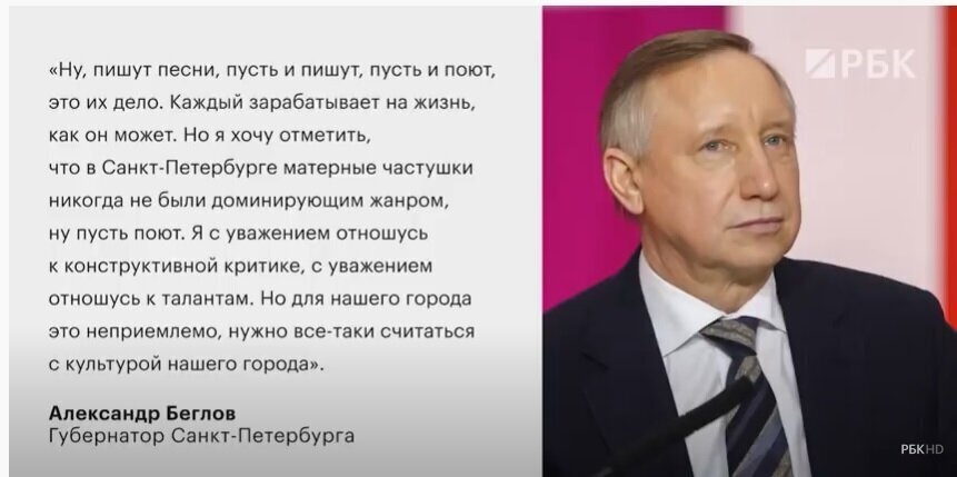 Губернатор Беглов Александр Дмитриевич ответил даже с юмором и постарался держаться вполне спокойно. Депутат ЗакСа Панов Д. В., правда, несколько заметнее обиделся и предложил лишить Шнурова С. В. права называться петербуржцем. А интернет-издание "Фонтанка. Ру" дало сюжет, как некоторое количество пакетов с мусором добавили для съёмки клипа на, и без того "живописный", уголок улицы Ефимова (кто не знает, самый центр Питера).