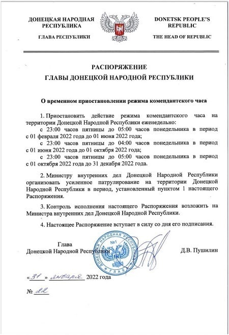 Распоряжением Главы ДНР № 22 от 31 января 2022 г. временно приостанавливается действие режима комендантского часа на территории Донецкой Народной Республики еженедельно